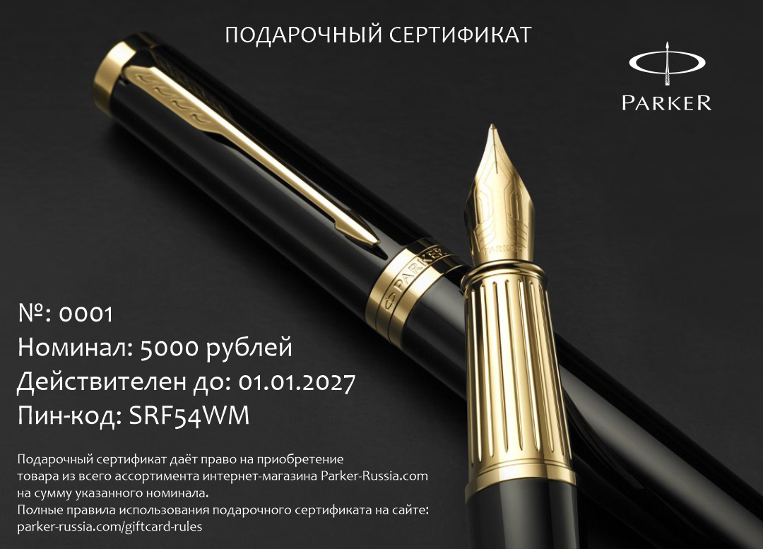 Подарочный сертификат Parker 15000 от официального дилера Parker в Белгороде. Вы можете дополнительно заказать гравировку, которая подчеркнет Вашу оригинальность и придаст памятность статусному подарку. Все ручки Паркер поставляются в фирменном футляре.